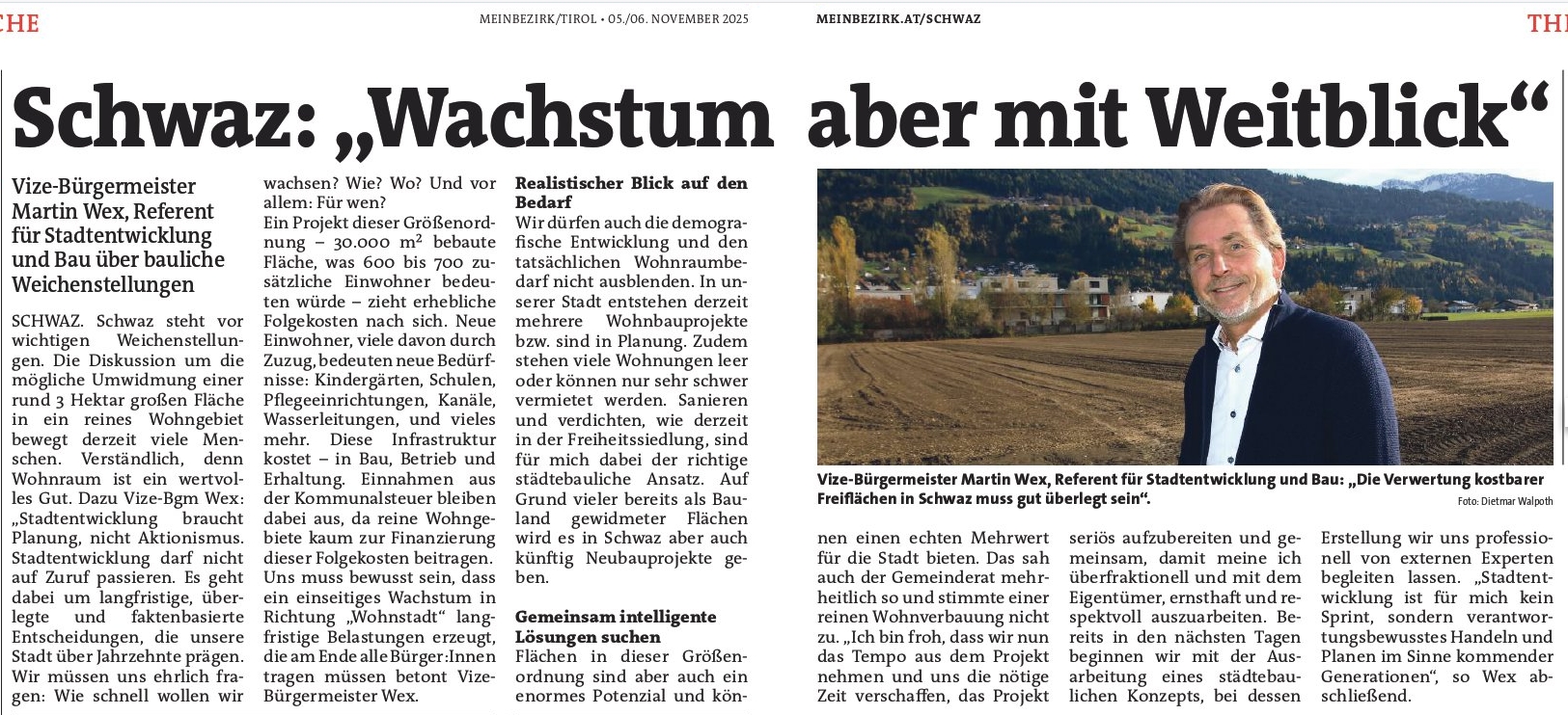 Schwaz steht vor wichtigen Weichenstellungen. Die Diskussion um die mögliche Umwidmung einer rund 3 Hektar großen Fläche in ein reines Wohngebiet bewegt derzeit viele Menschen. Verständlich – Wohnraum ist ein wertvolles Gut. Das Bezirksblatt hat den zuständigen Referenten Vizebürgermeister Martin Wex dazu befragt.