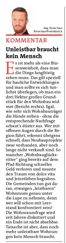 Ein Projekt dieser Größenordnung – 30.000 m² bebaute Fläche, was 600 bis 700 zusätzliche Einwohner bedeuten würde – zieht erhebliche Folgekosten nach sich. Neue Einwohner, viele davon durch Zuzug, bedeuten neue Bedürfnisse: Kindergärten, Schulen, Pflegeeinrichtungen, Kanäle, Wasserleitungen, und vieles mehr. Diese Infrastruktur kostet – in Bau, Betrieb und Erhaltung. Einnahmen aus der Kommunalsteuer bleiben dabei aus, da reine Wohngebiete kaum zur Finanzierung dieser Folgekosten beitragen.